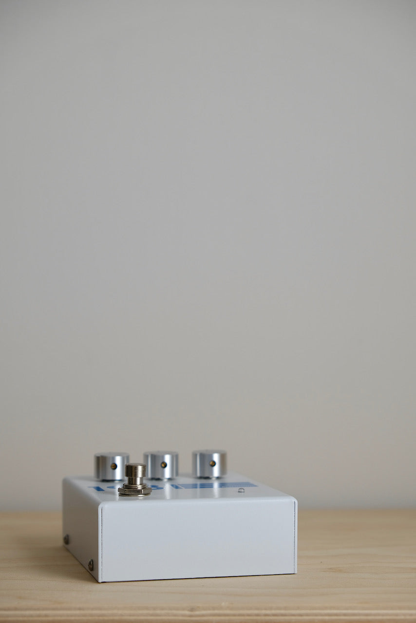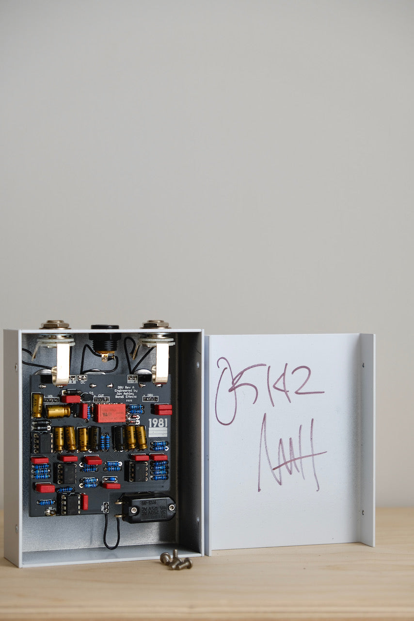 I have been working on this project for the better part of three years, as a collaboration and with engineering by Jon Ashley of Bondi Effects. I feel that the pedal is unique in design and sonically unlike anything I have ever heard, especially in the lower gain and boost settings. There is a subtlety that feels more like a vintage pedal than a modification of a classic. There are two circuits present in the pedal, one distortion and one preamp boost, running at 18v via an internal voltage regulator. I made this pedal with the idea to create a distinction for my own sound, and what I found is that it is an extremely useful tool for capturing a lot of different types of sounds. I am most proud of the lower gain side, as I feel it is the most unique section of the pedal, but I must also include that the gain section is extremely sweet sounding throughout, especially for heavy and complex chords. There is a midrange punch that I love and a warmth and thickness that reminds me a bit of a ribbon mic. When the development of this pedal turned into something new and unique, it became the catalyst to starting 1981 Inventions, so I decided to make this the first official release.