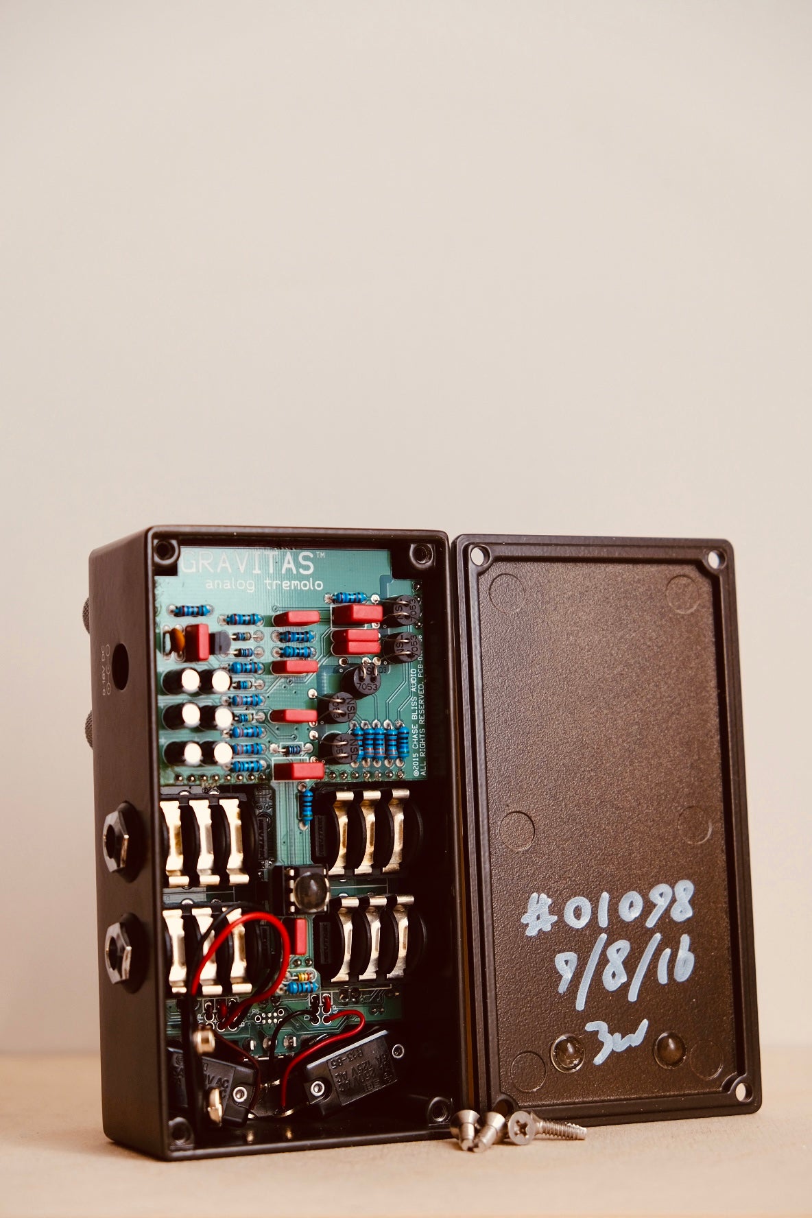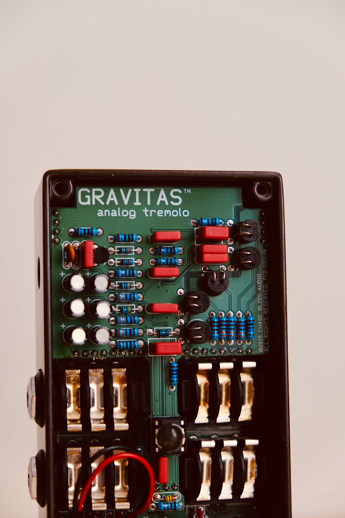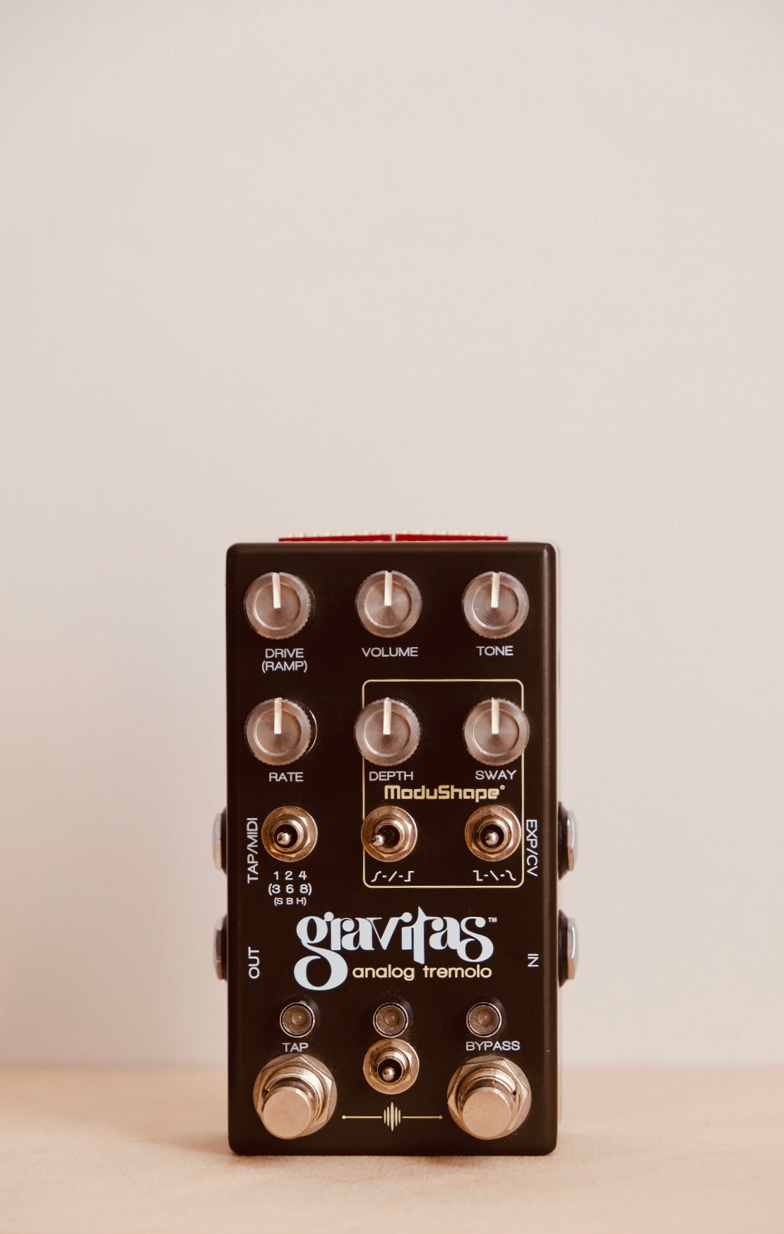The Chase Bliss Gravitas is a tremolo pedal features an all-analog signal path that can do any variety or shape of standard volume modulation, harmonic tremolo (inspired by vintage Brown panel) or both simultaneously for a truly unique and beautiful tremolo sound that sits just perfectly in a mix. The first thing your guitar hits in the signal path is a gorgeous, transparent, discrete class A clean boost circuit, and is followed by buffering and tone shaping with famed Analog Devices AD823 opamps for perfect tonal clarity, and analog warmth. Further, every knob and switch is connected to a little digital brain while your guitar signal stays 100% analog the entire time and never gets digitally processed. Since the control of the effect is digital, it opens up unprecedented effects and features that have never been heard or offered in analog stompboxes.
