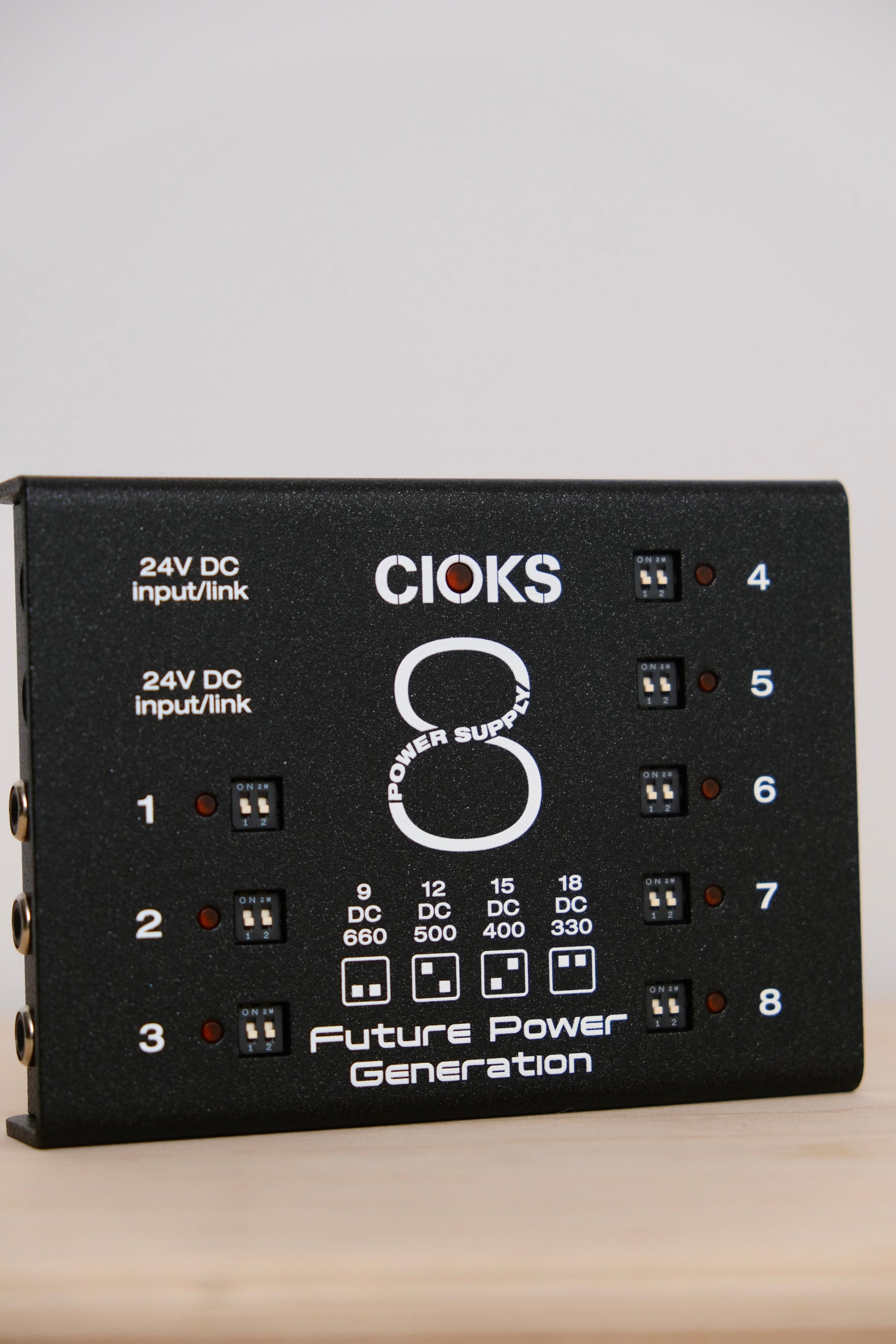 CIOKS 8 is our largest switch-mode power supply extender and it features 8 isolated outlets which each deliver 9V DC with 660mA. All eight outlets offer four selectable voltages (9V, 12V, 15V and 18V).