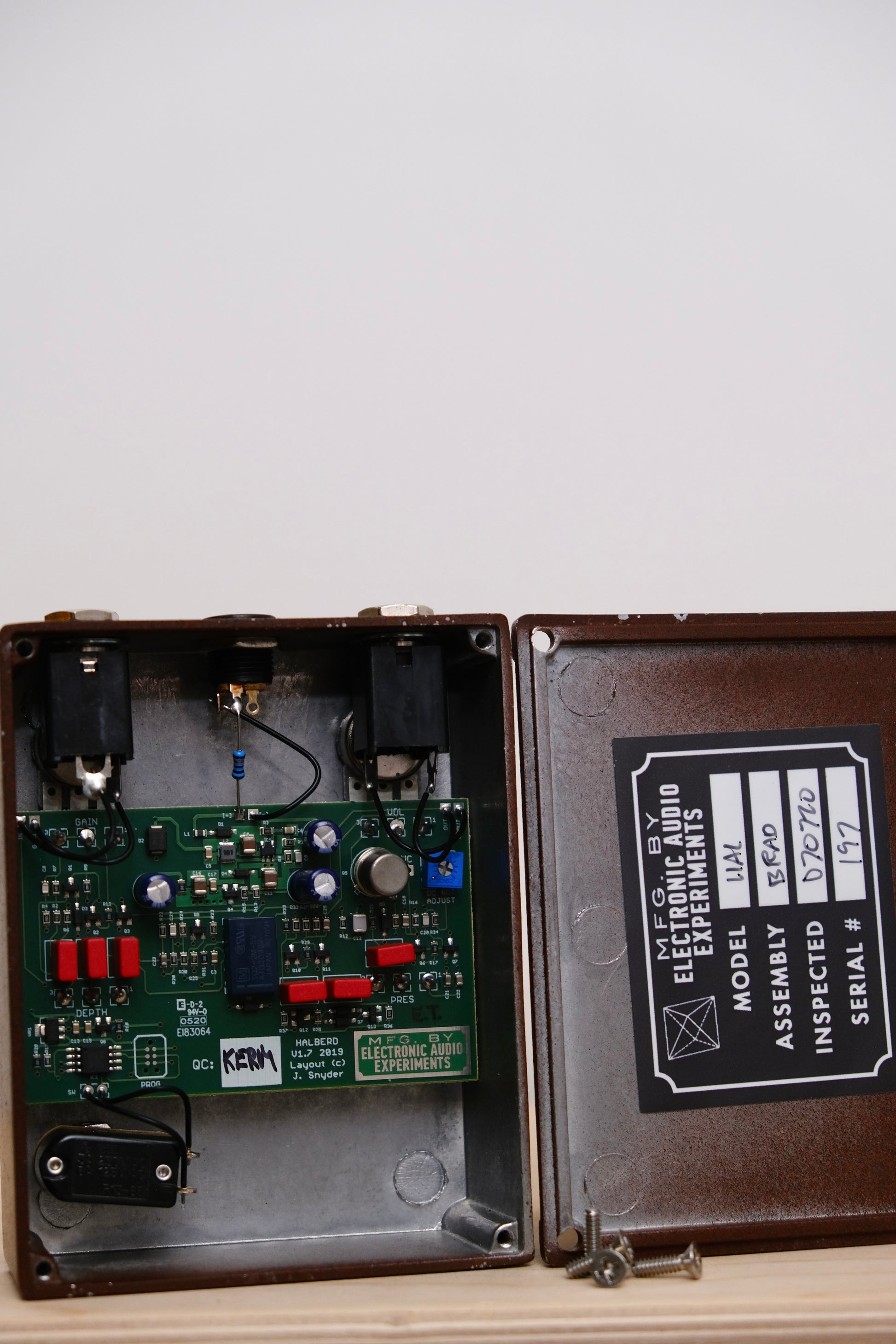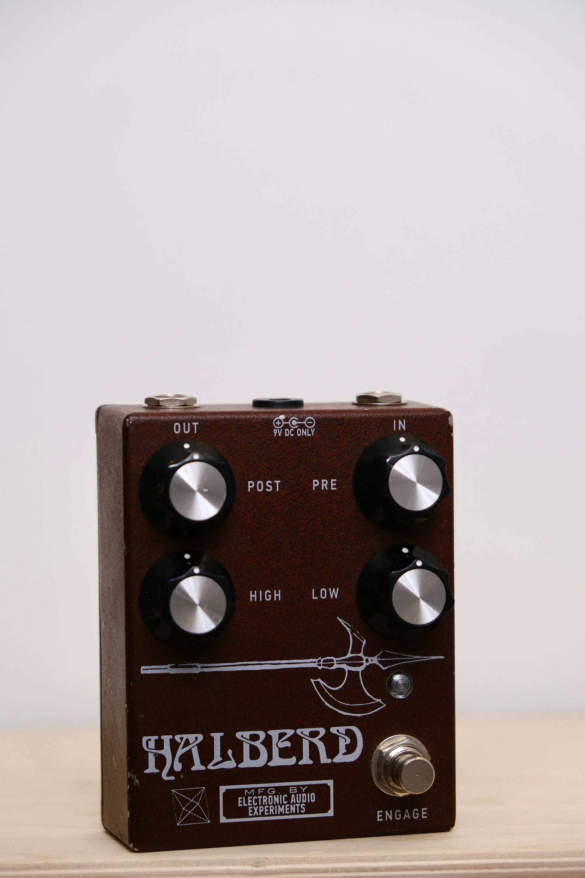 The Electronic Audio Experiments Halberd is a discrete transistor overdrive circuit designed for the greatest possible dynamic range and note clarity. It fills a special niche our family of drive pedals—a medium-gain device with the harmonic fullness and grind of a much higher-gain pedal, one that stands apart from both the brazen buzz of op amp distortion and the smooth breakup of JFET amp emulations alike.