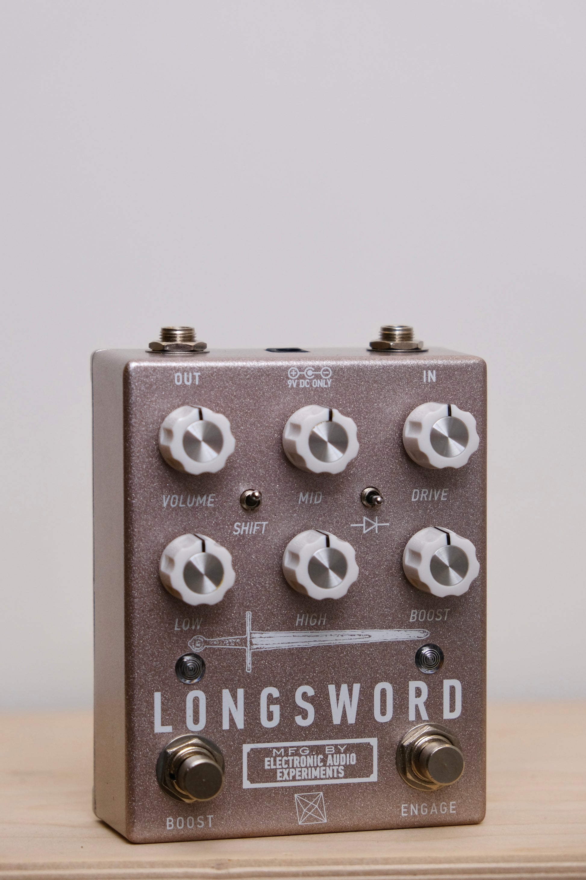 The Electronic Audio Experiments Longsword is yet another contender in the endless void of op-amp based drive pedals—familiar but with some novel twists. Cascaded gain stages allow for the full range from clean boost to massive distortion, all without sacrificing tonal flexibility. The equalizer combines bass and treble shelving filters with an active, frequency-selectable midrange boost/cut control. This lets the user sculpt a diverse array of tones and carve out a niche in even the most dense of mixes. The Longsword has a broad frequency response which makes it work equally well with guitar, baritone, and bass.