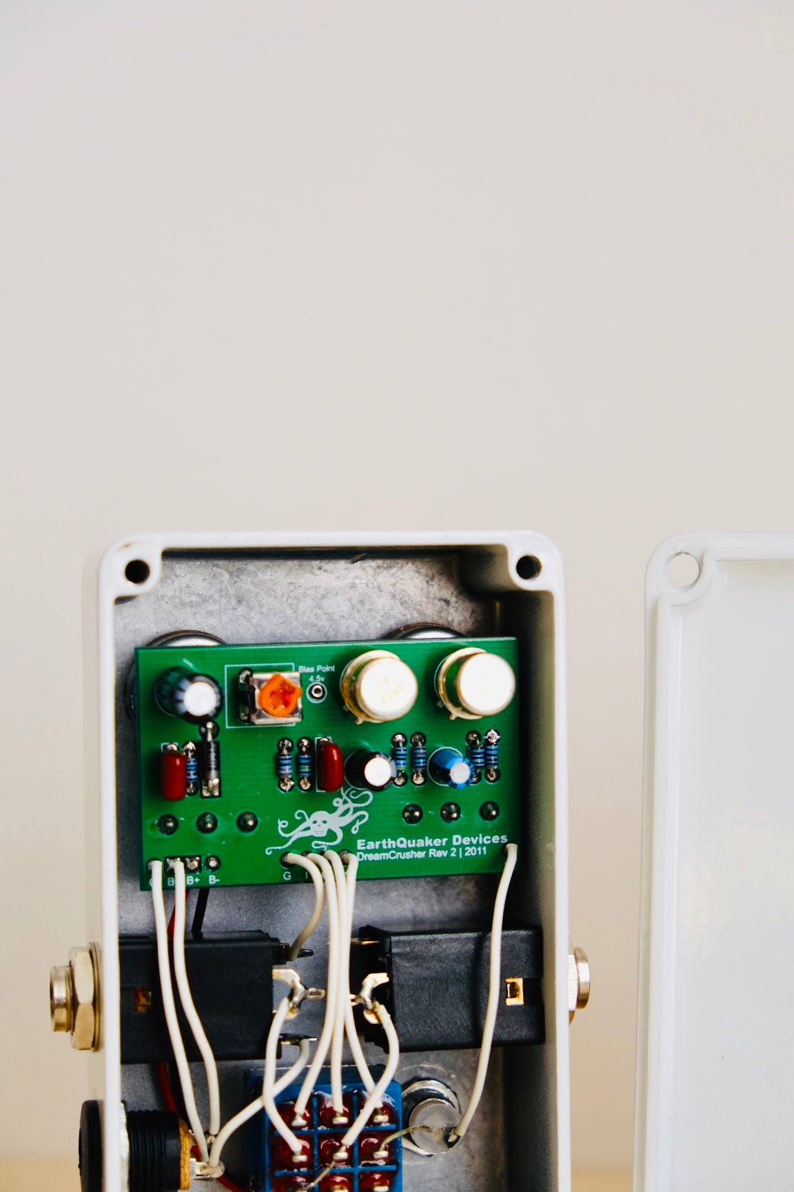 The Dream Crusher is a germanium fuzz effect designed to make your guitar sound more awesome. There are two simple controls: Fuzz and Level. Fuzz Controls how sweet you want to sound and Level controls how much you want other people to hear how sweet you sound. Even though it has a simple interface, there are many tones and textures waiting to be unleashed. We recommend setting the Fuzz to taste then adjusting the Level to unity, roughly noon on the dial. Playing with a band? Bump up the Level a couple notches to make it extra rad. If being extra rad isn’t your thing, bring it all back down to zero and rip in silence. Your call chief. We also recommend placing it first in your signal chain and before any buffered pedals for optimal awesomeness.