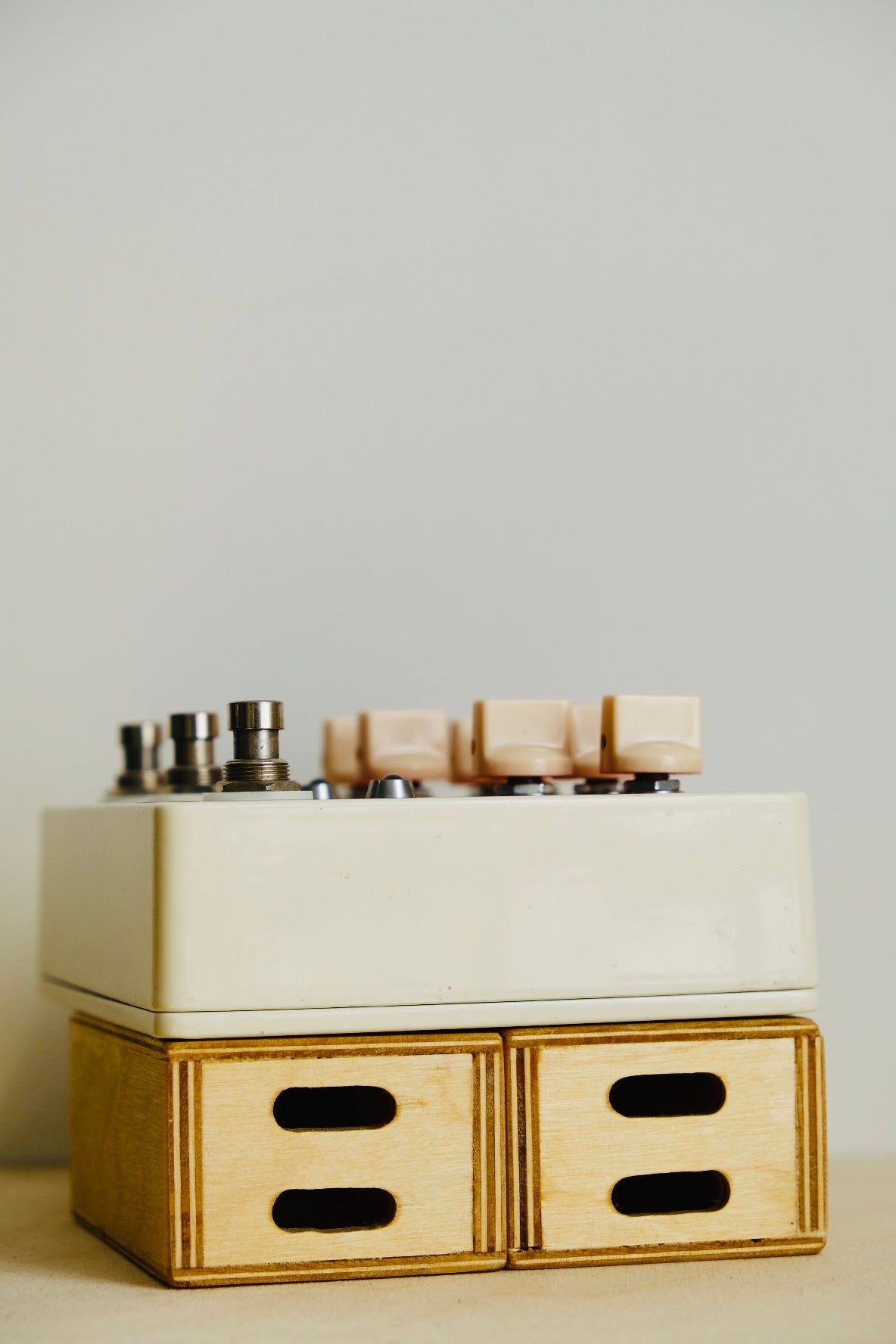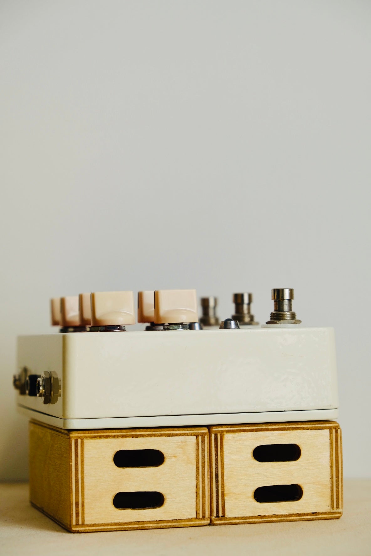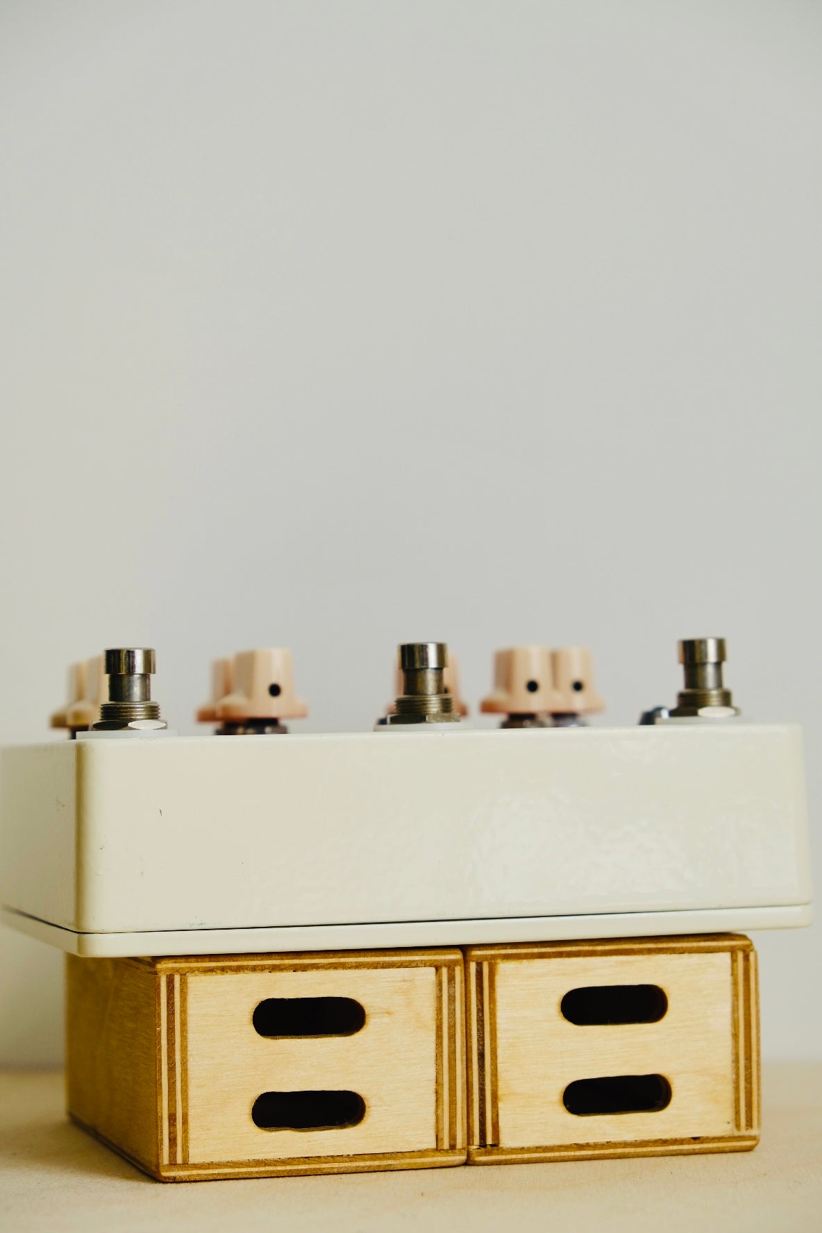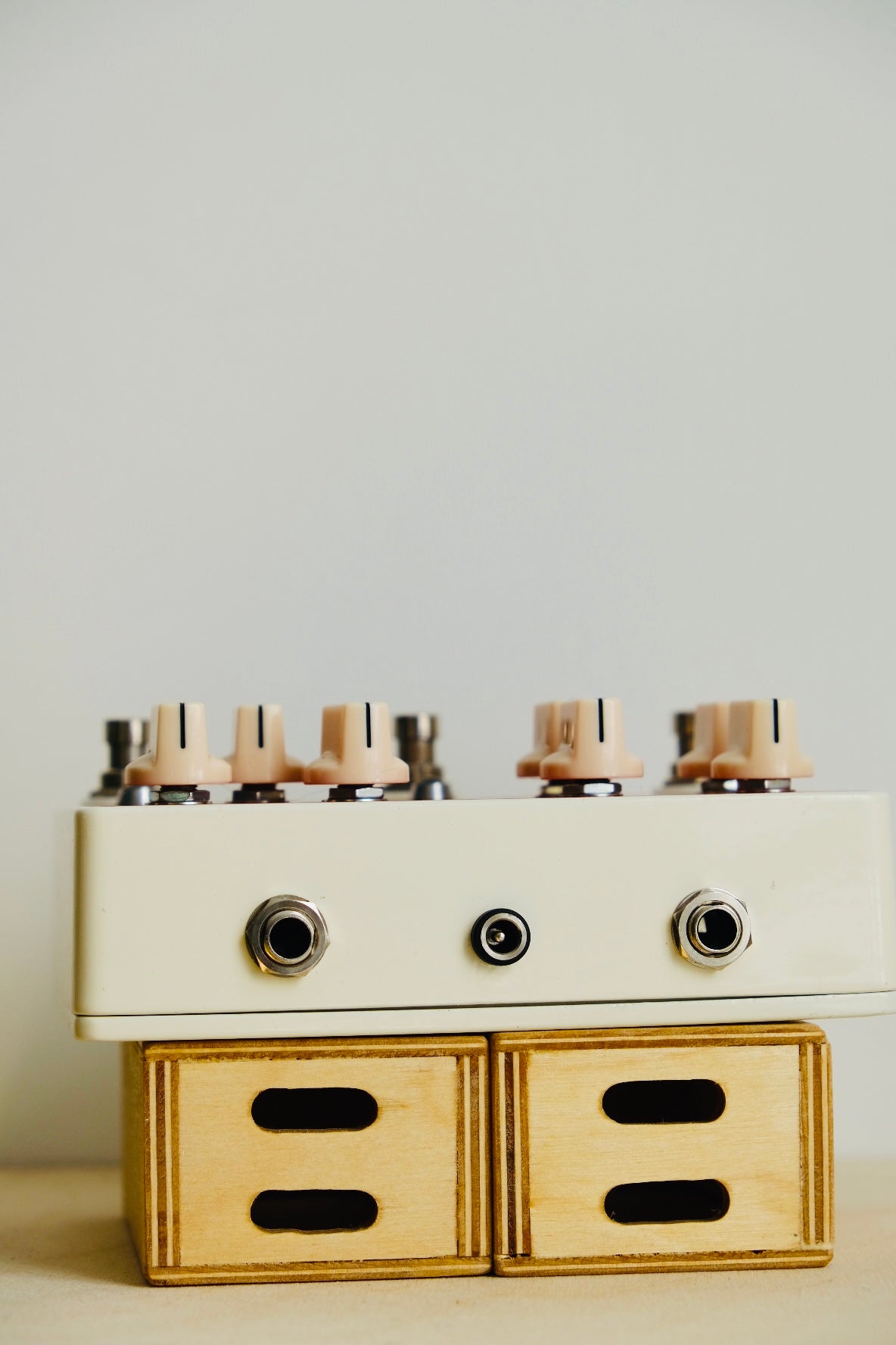 Our flagship device! The Hoof is a no-fuss, easy-to-use device capable of sounds from warm, gritty overdrive to a huge, sustaining fuzz. It’s a germanium/silicon hybrid Muff-style fuzz (based on the old green Russian muff) with massive amounts of volume on tap and smooth amp-like sustain. It has a tighter, cleaner sound than most Muff’s which makes it more cutting and discernible in a band setting. The shift control is the key to the Hoof’s character, it alters the frequency response of the tone control. Clockwise scoops the mids and counterclockwise enhances the mids. The Hoof has become the go-to fuzz for many well-known fuzz connoisseurs.