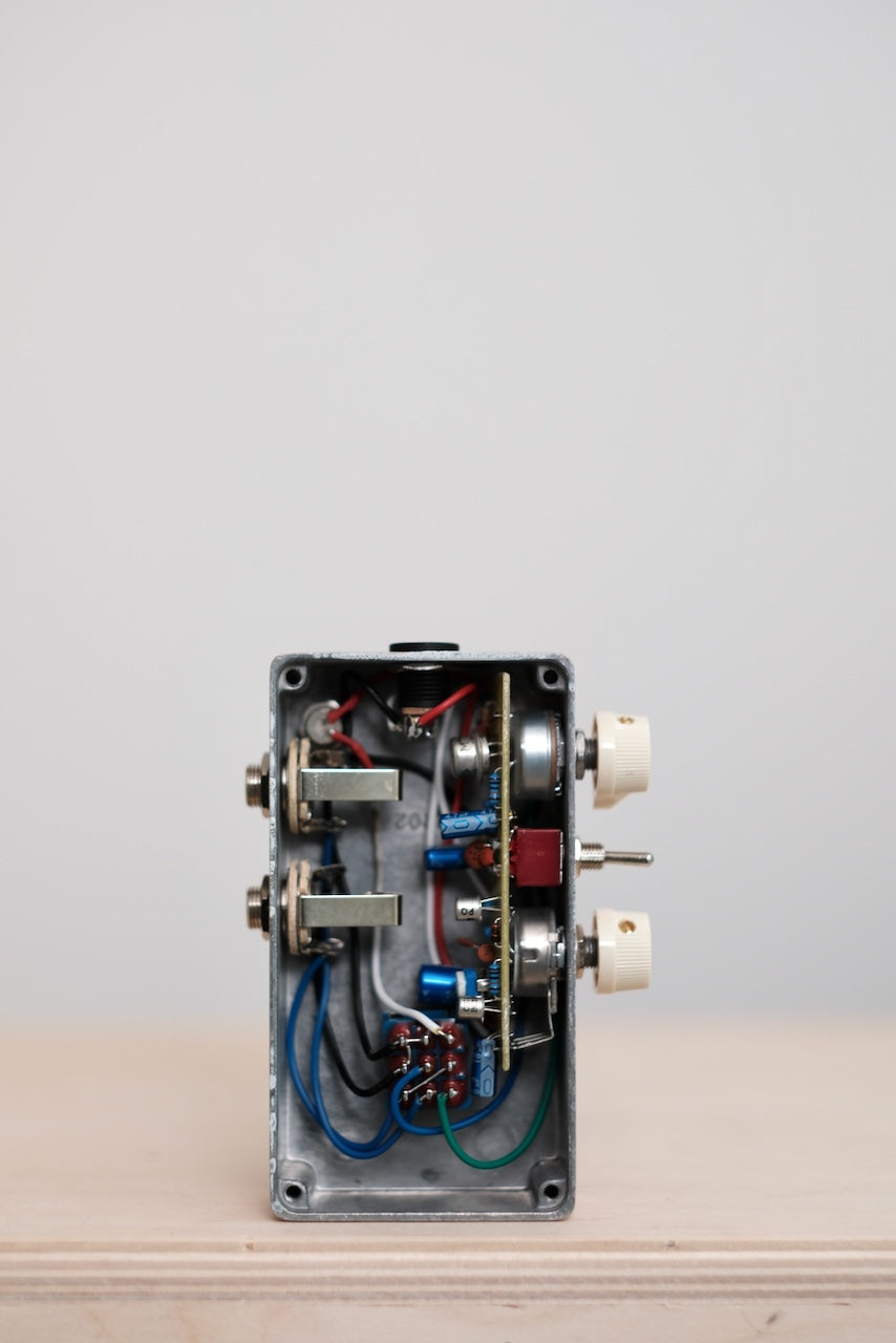 The concept is simple, the Jimi/Jimmy will make you sound like Jimi (Hendrix) and the Jimi/Jimmy will make you sound like Jimmy (Page). That is to say that the Jimi/Jimmy is a Fuzz Face and a Tone Bender MKII in one enclosure. The Fuzz Face portion (accessible when the toggle switch is in the up position) uses silicon BC108 transistors, a highly revered transistor choice for the Fuzz Face circuit. The Tone Bender portion (accessible when the toggle switch is in the down position) introduces a germanium transistor based stage at the input of the circuit. The Jimi/Jimmy contains two tonal legacies in one, and in this economy that’s a deal you don’t need to think twice about.