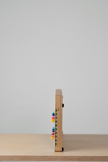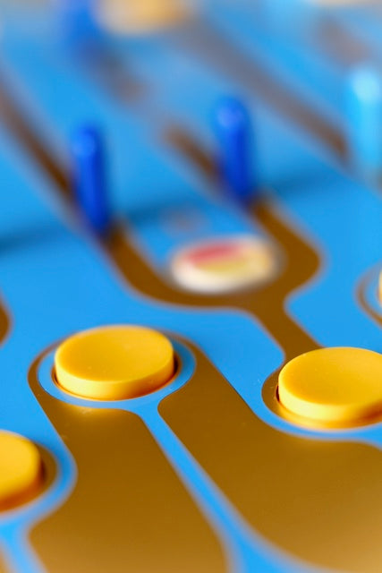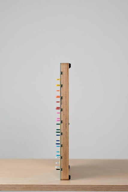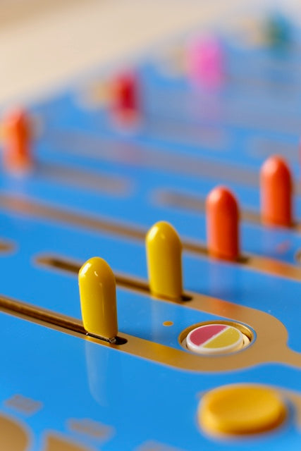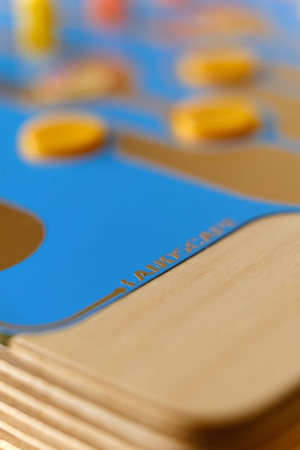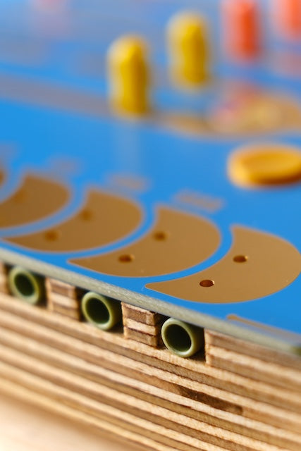 Materials: Gold plated PCB (2mm fiberglass) / routed Birch plywood case with clear coat / metal shaft sliders with rubber caps / concave and dual LED latching push buttons