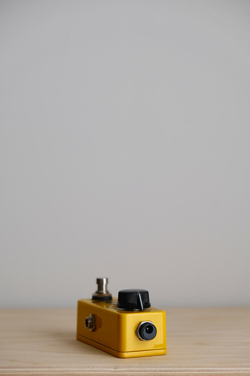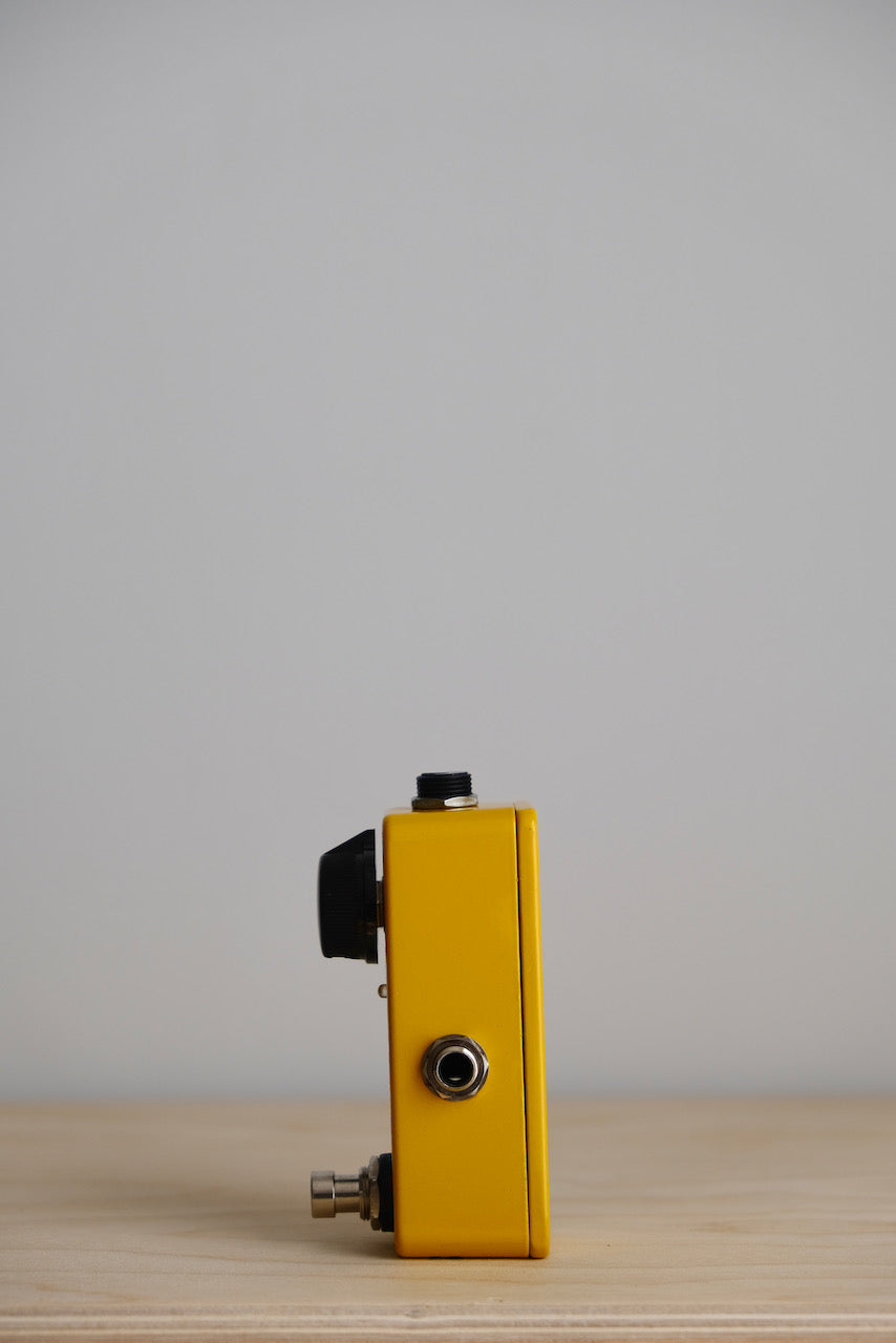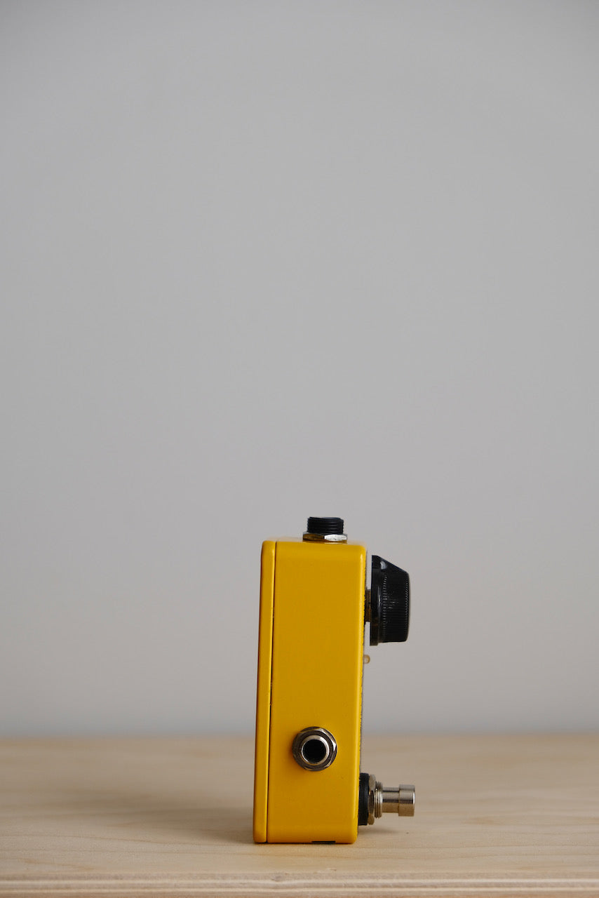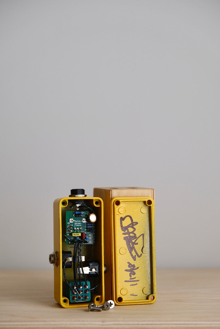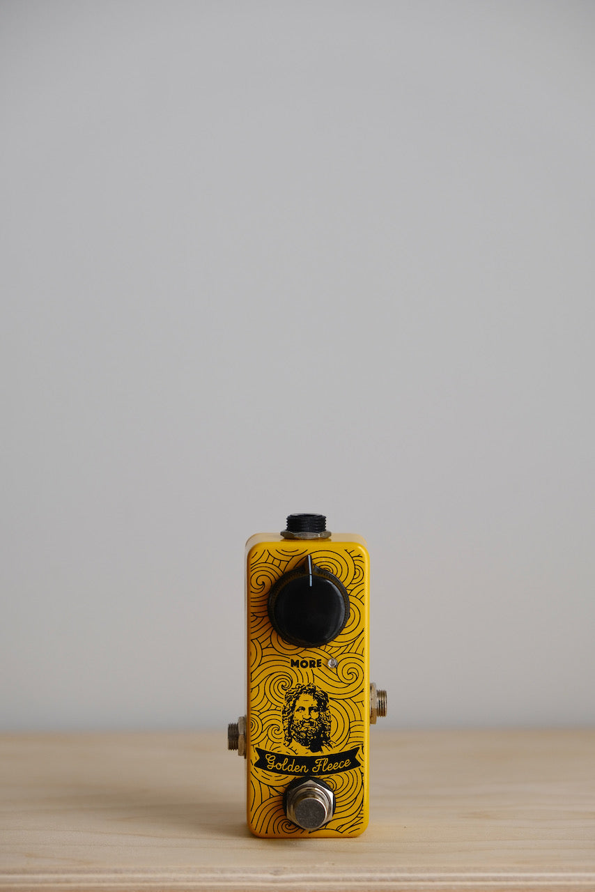 This circuit began its life as a clone of an Alan Yee “Fuzzy Nuts” which was supposedly used by Wilco's Nels Cline. After years of production and tweaking the circuit has pushed beyond these initial clones to offer up more gain and volume while also reducing the noise. This simple one knob unit lives in your guitars volume and tone controls. The Golden Fleece cleans up better than almost any other fuzz out there and the single knob on the unit is a master volume control. The unit has a very balanced tone that doesn't shift your guitars sound just offers a biting, yet full sound that would work for a variety of musical styles.