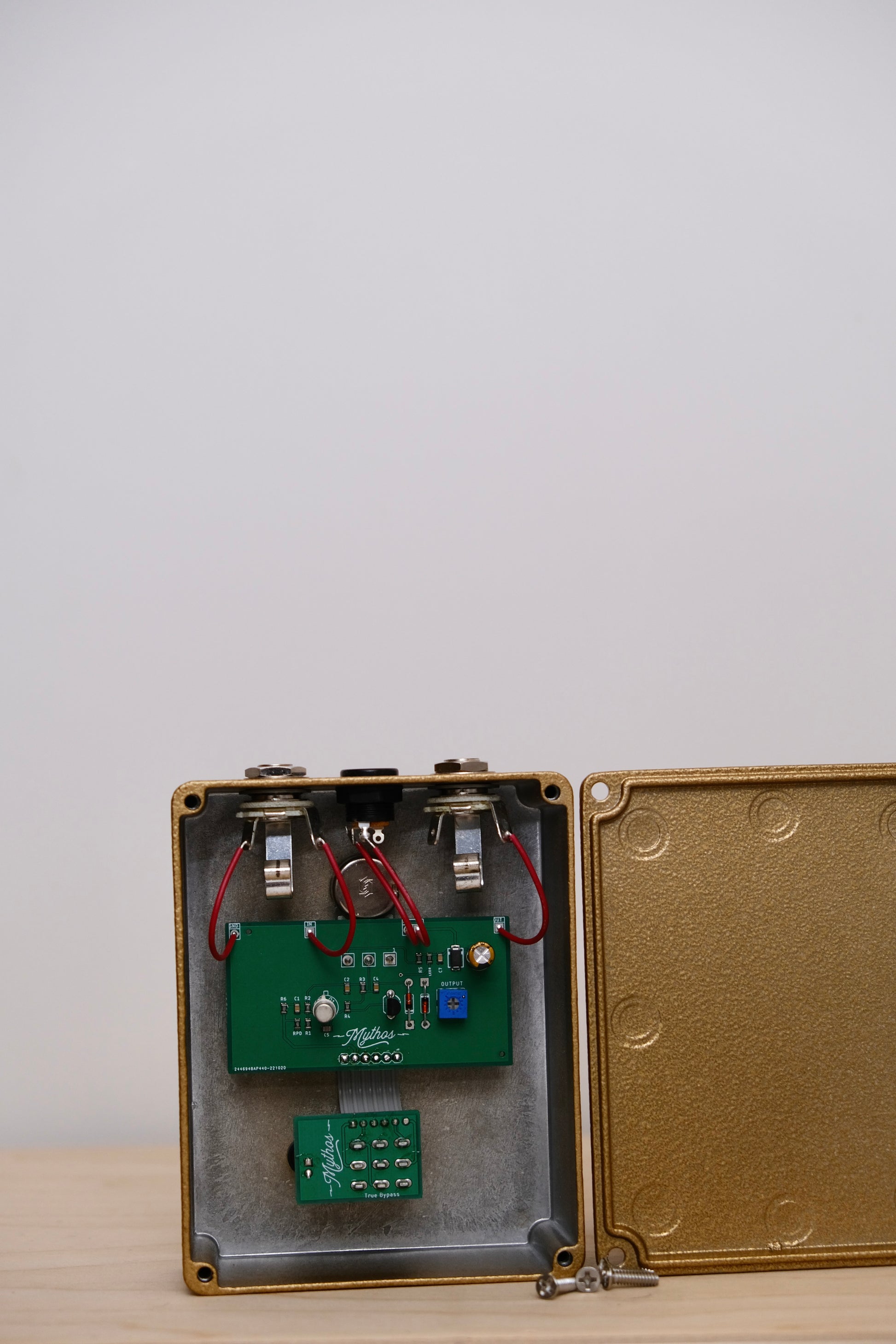The WARNING knob on the face of the pedal does not control volume, it doesn’t control gain, it controls voltage feeding the circuit! When maxed out the circuit sounds like the best of the classic circuit, but as you turn the knob down and adjust the overall voltage entering the circuit. Once the knob hits 1 o’clock something magical happens, a sub octave begins to be introduced! When and where it appears will be very dependent on your guitar and amp setup but it creates a sub octave synth effect that is unlike anything we’ve ever tried from a simple analog device. Further reducing the voltage or WARNING knob will cause even more octave things to happen while reducing the overall gain of the circuit. Internally there is a master volume so you can adjust the overall output of the pedal. Be warned, this circuit is loud!