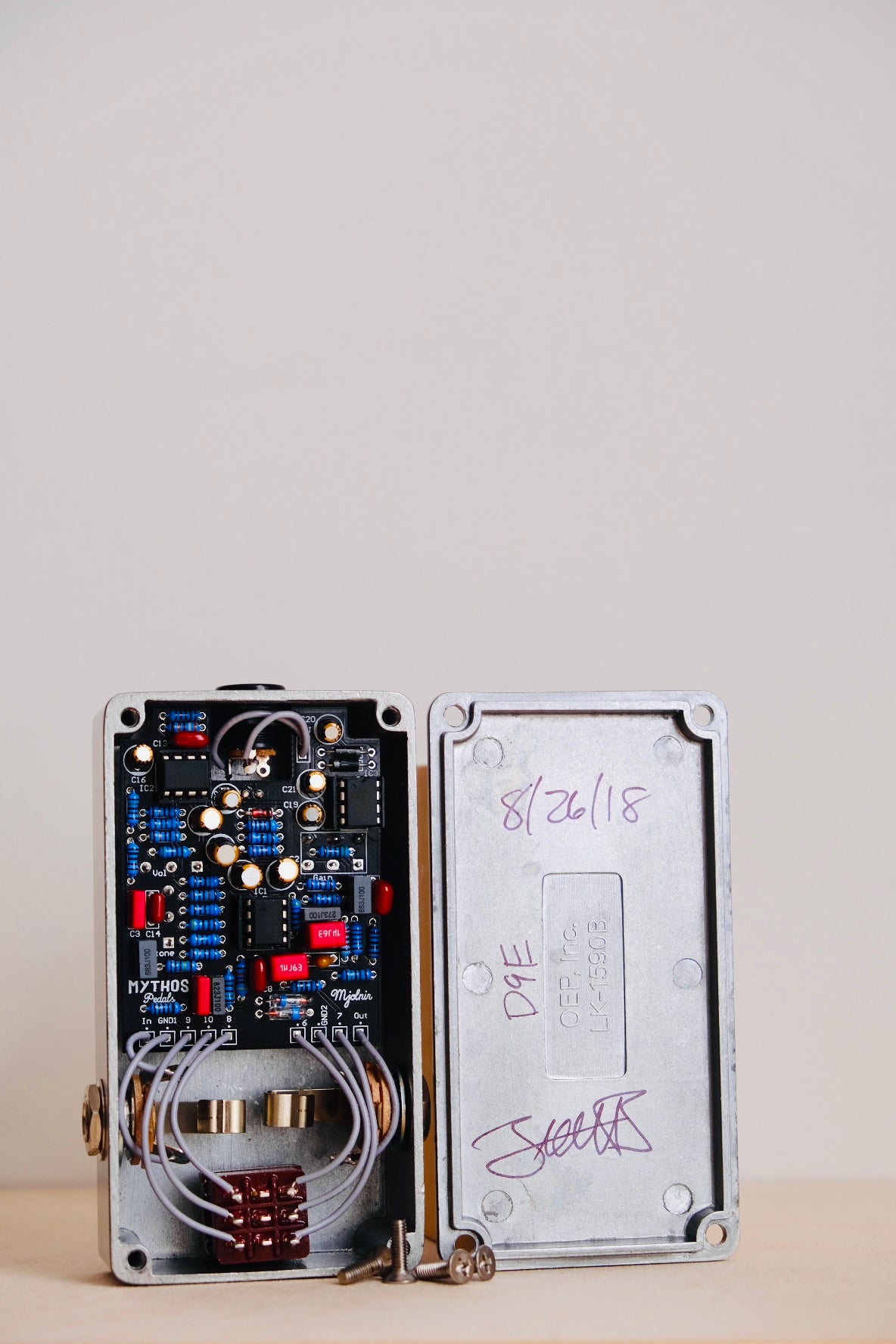 This is a limited edition Mjolnir produced in the late summer of 2018. Features germanium hand matched diodes, Dakaware oxblood knobs and an aluminum enclosure. Compared to other Mjolnir builds, this has a softer tone that is more compressed and has less gain.