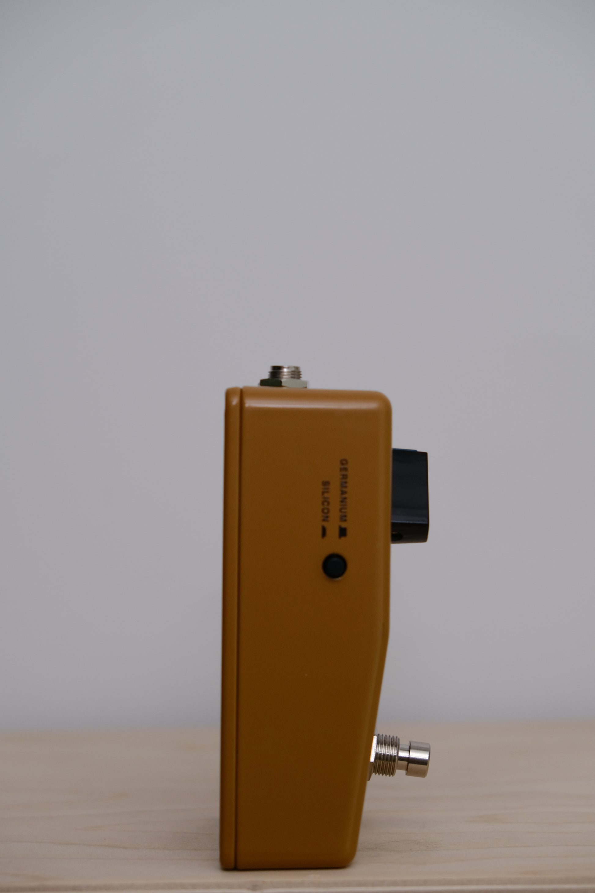 “Level” controls the volume (right is louder, left is quieter). “Distort” controls the amount of hard-clipping distortion (right is more distorted, left is less distorted). The side push switch allows the player to toggle between two different versions of the circuit produced during its fifteen year history: Germanium mode ( “Era 2” version) and Silicon mode ( “Era 3” version). The footswitch activates the pedal via soft touch bypass switching and the status LED indicates that the circuit is active.