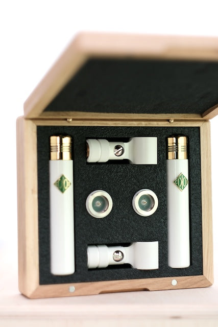The blue badged 013 TUBE comes as a stereo pair in a handcrafted oak suitcase that includes a stereo power supply with built-in 20dB pads, two custom 4-pin cables, and mounting clips.