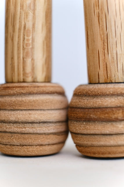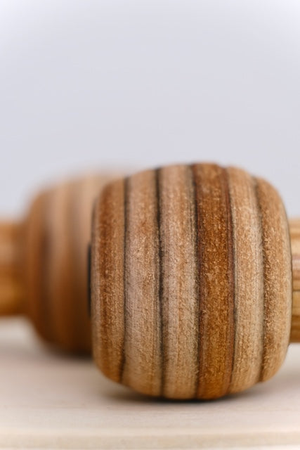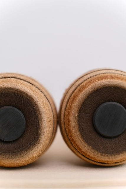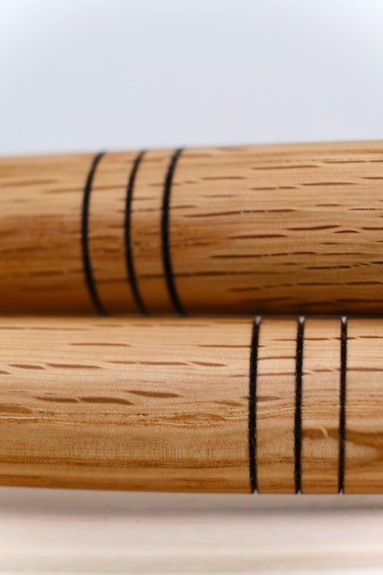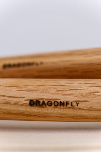 The Dragonfly Veg Tan bass drum mallets are constructed of 6-8 layers of thick veg-tanned saddle leather on a hand-turned, tapered oak handle. The discs are sanded on the lathe to give them a rounded profile. These mallets function in much the same way as a standard chammy covered sticks, but have a fuller, darker sound and also never need rewrapping. The small sticks are great for fast, athletic passages where maximum articulation is required. They’re slightly heavier than the average “Rite of Spring” sticks, are very well suited to that excerpt and have a HUGE sound. SOLD AS A PAIR.
