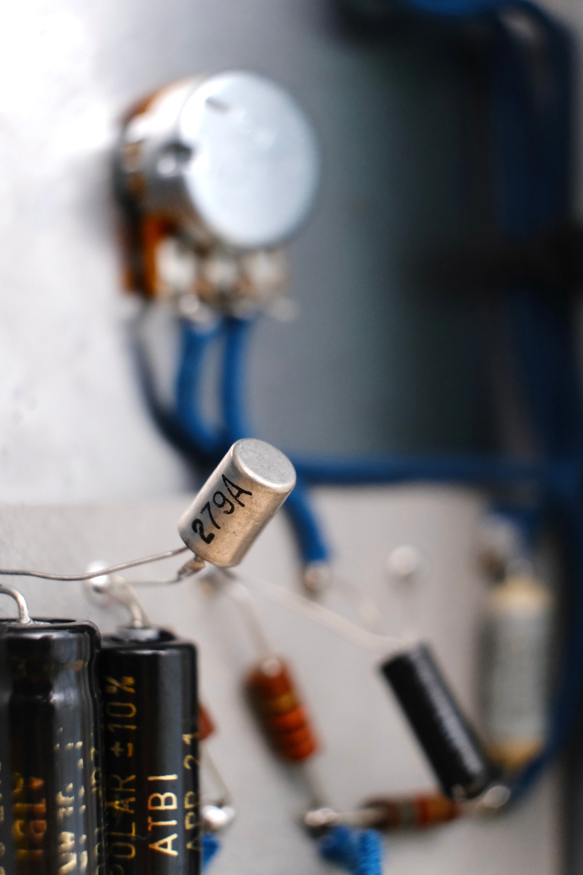 Made in Germany. Based on the fuzz face with bias control (voice) with both NOS and high quality parts inside. Nitrocellulose lacquer finish with checking and a relic job. Screen printed graphics.